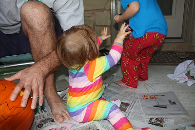 I put our pumpkin outside on Tuesday night (two nights before Halloween) and when we went outside on Wednesday mornign the jack-o-lantern was totally moldy and squishy. It was so gross. I was shocked that it was destroyed so quickly and was bummed that we didn't get to light it...next year!